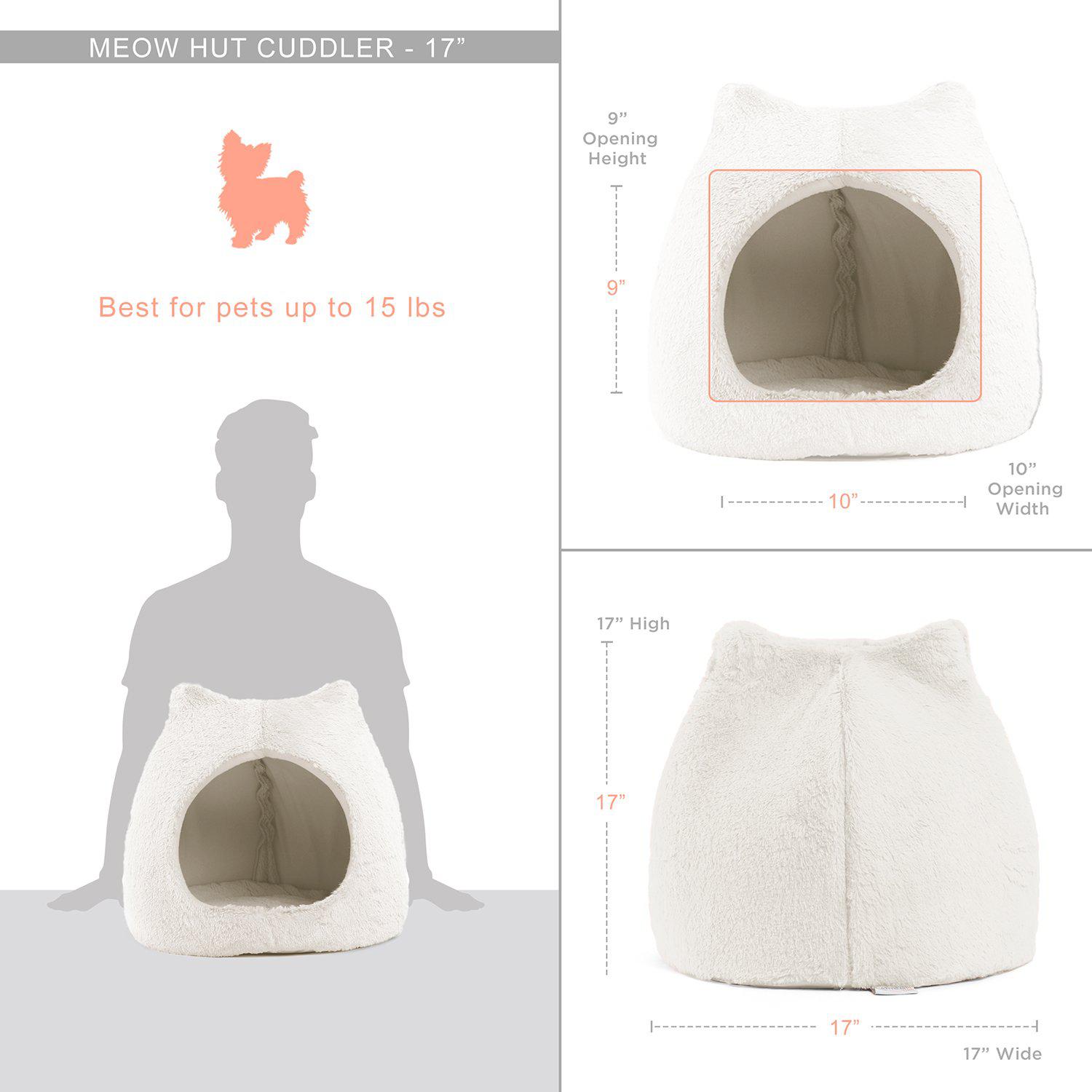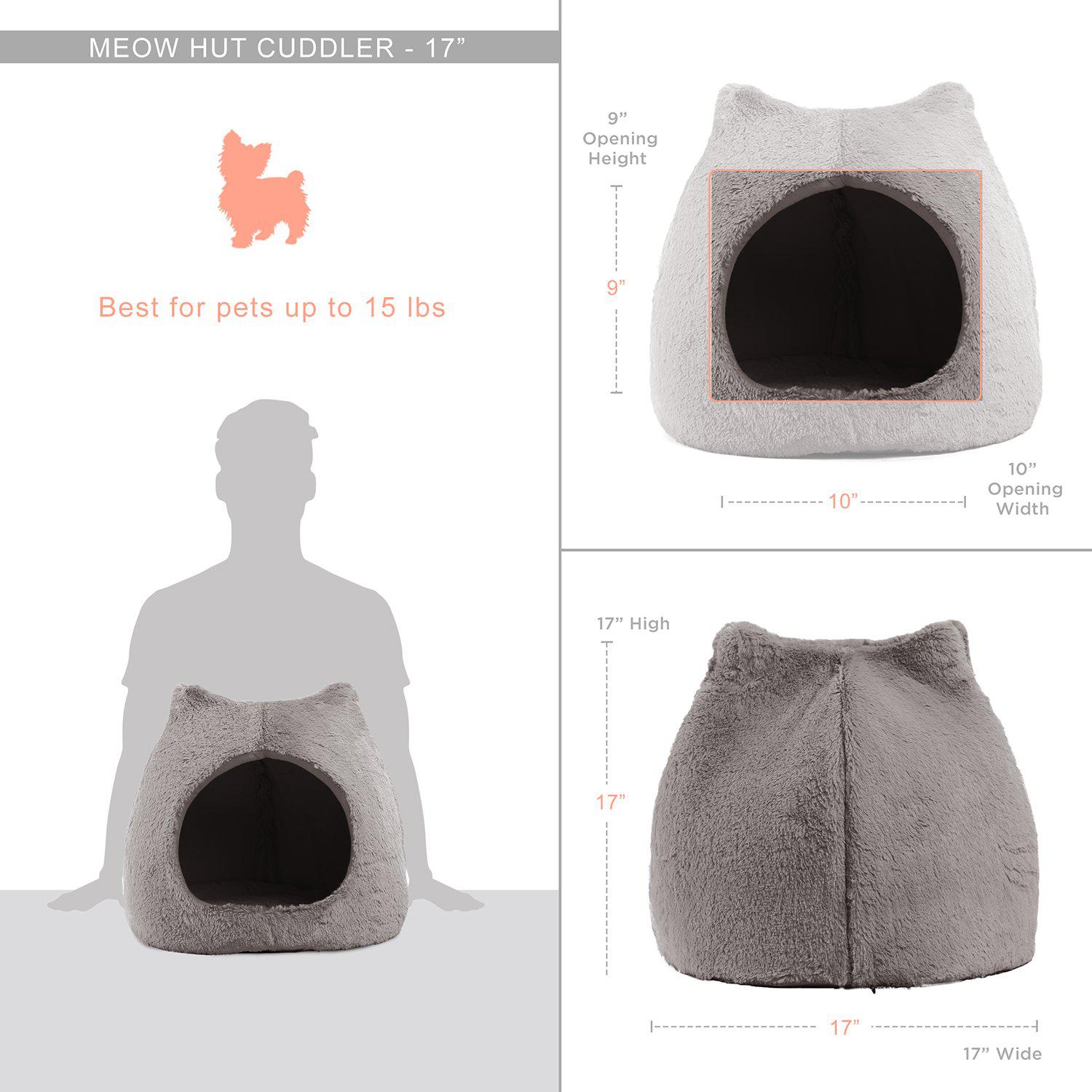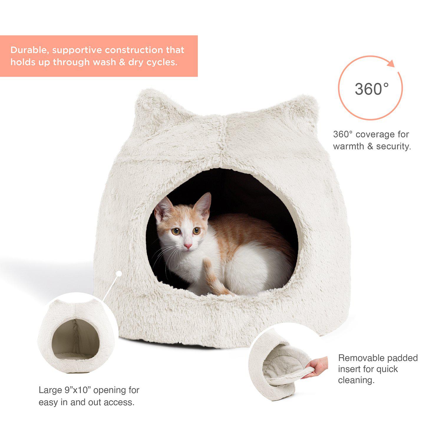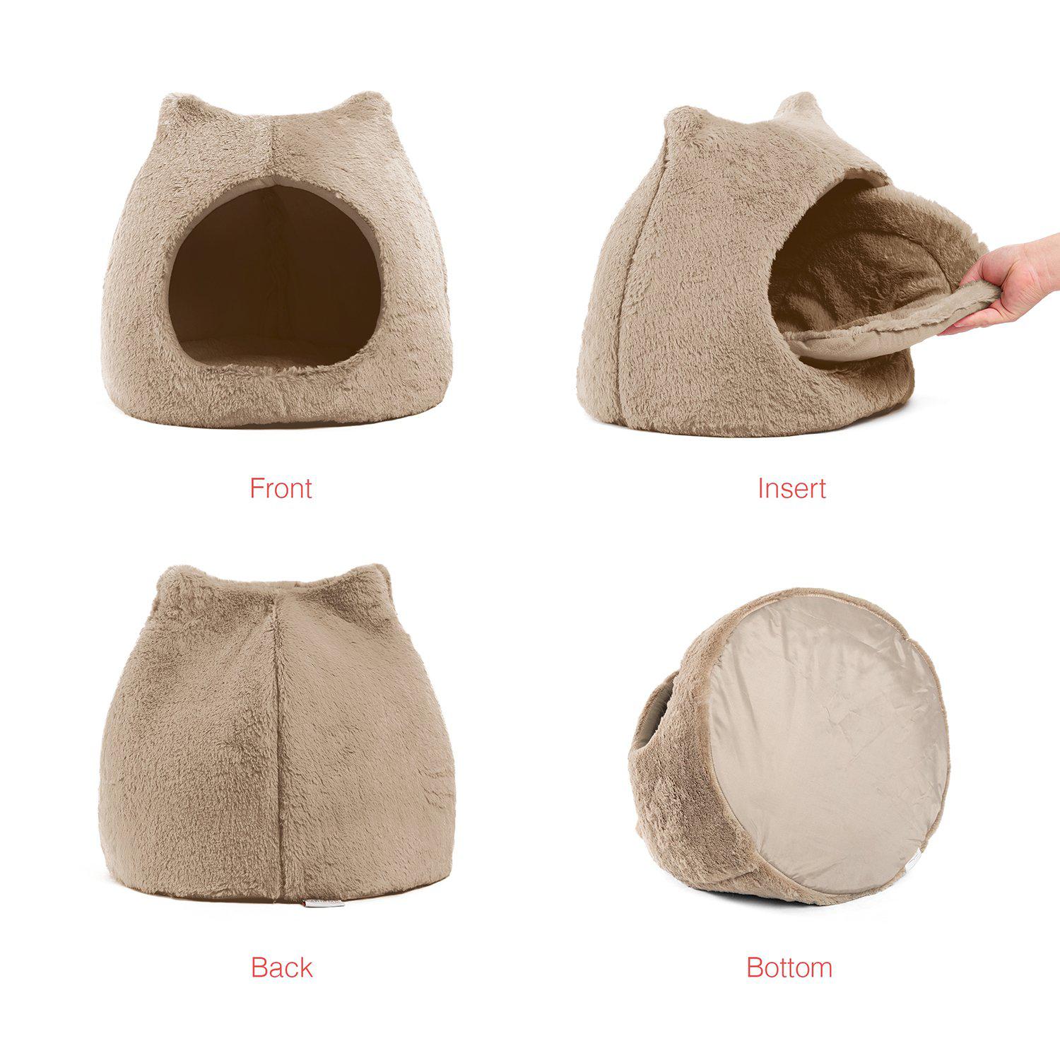 A fun and innovative pet hut featuring adorable cat ears! it is the perfect hideaway for your reserved furry friend, providing him/her with complete coverage, privacy, warmth, and comfort. Even though this hut is designed with cat ear silhouette, it is meant for both cats and dogs to enjoy. Made with a durable foam construction that is flexible, lightweight, and easy to manage. The exterior is made with ultra-soft luxurious faux fur fabric and a tough woven oxford bottom that is dirt and water-resistant. Pet hut includes a removable insert for quick clean-ups.